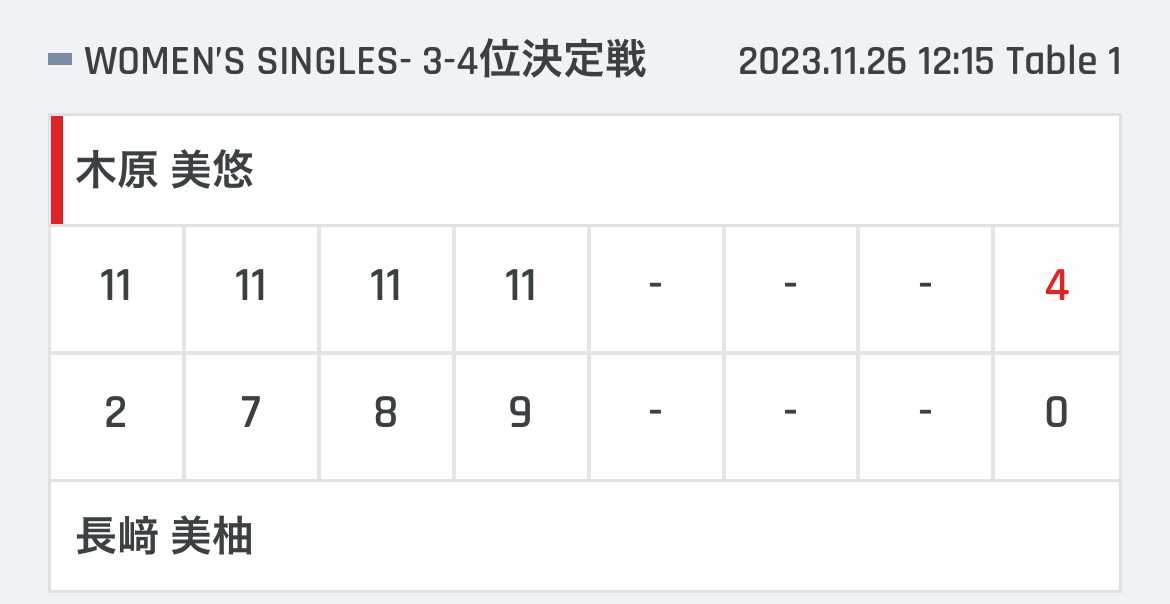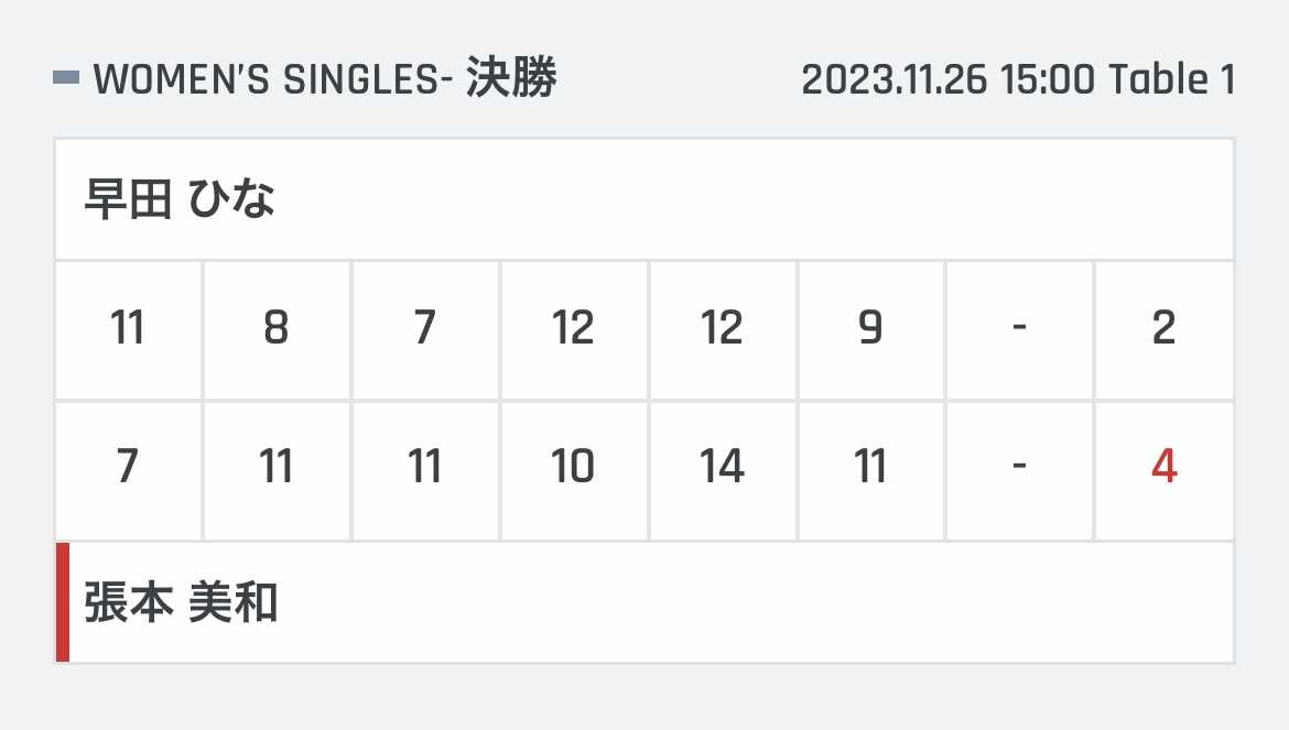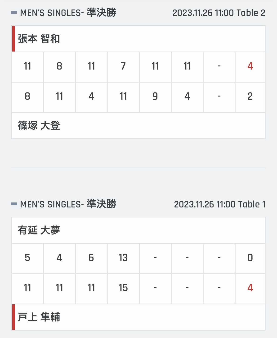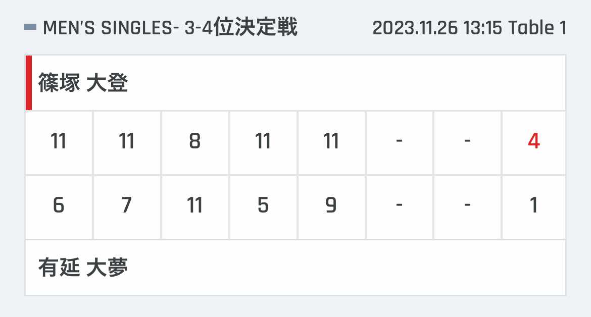 | 張本智和 | 11 | 8 | 11 | 7 | 11 | 11 | * | 4 |