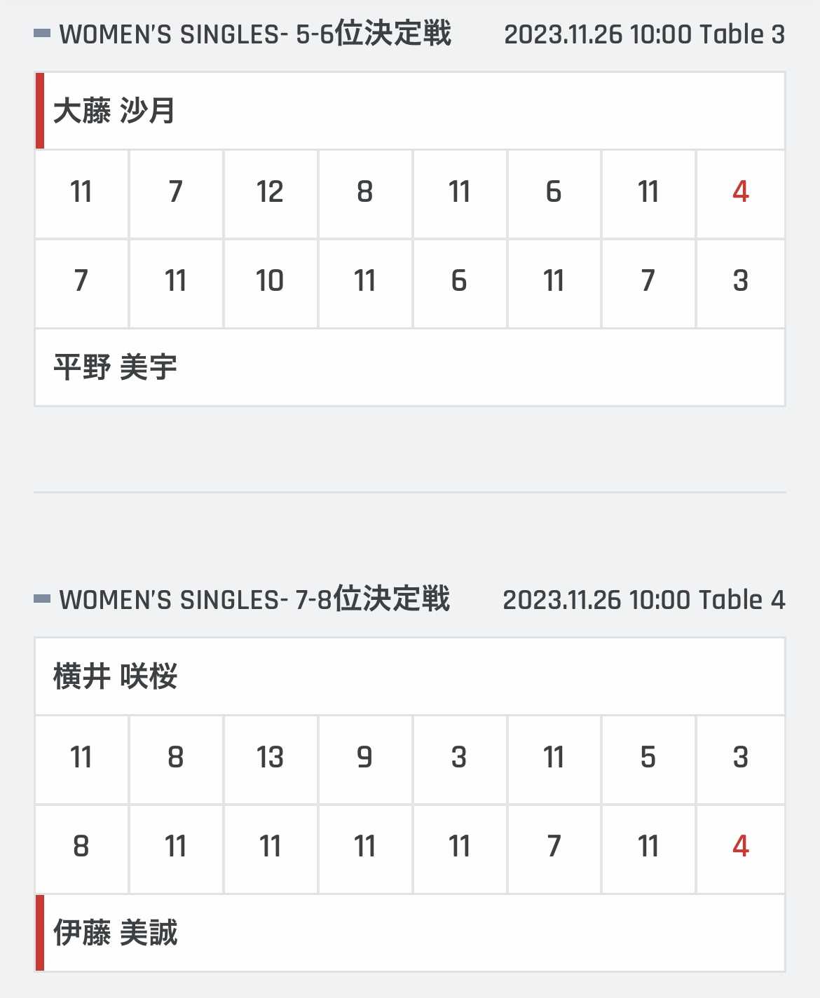・ 大藤沙月 4-3 平野美宇 (11-7,7-11,12-10,8-11,11-6,6-11,11-7)