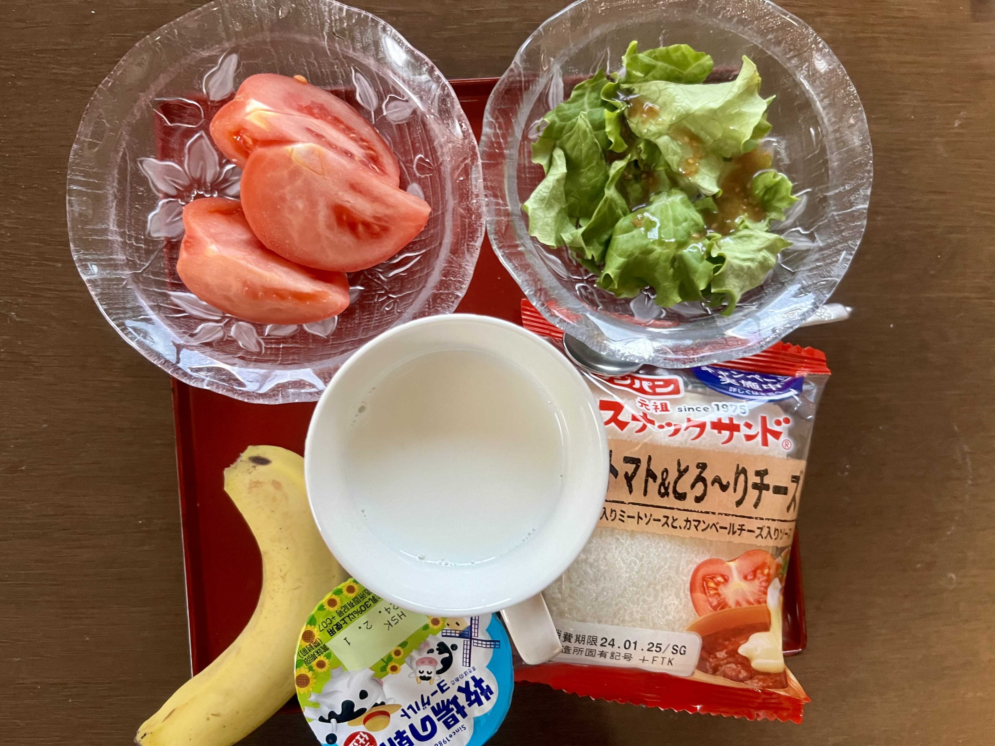 朝食は、スナックサンド・トマト&とろ~りチーズ、トマト、サニーレタス、バナナ、ヨーグルト、牛乳。