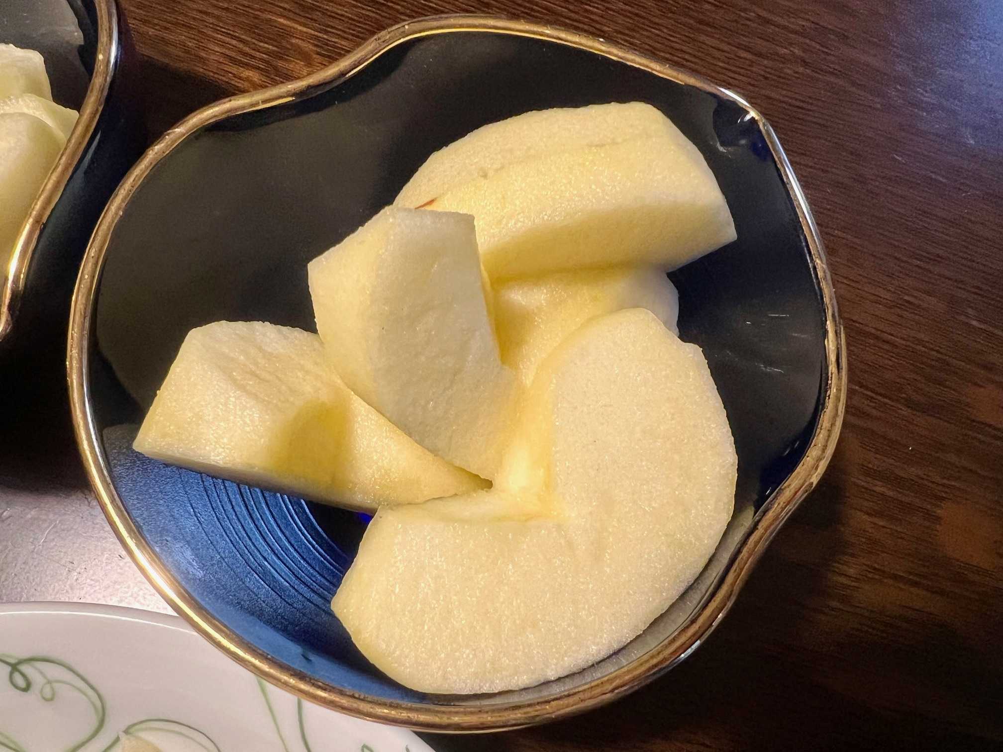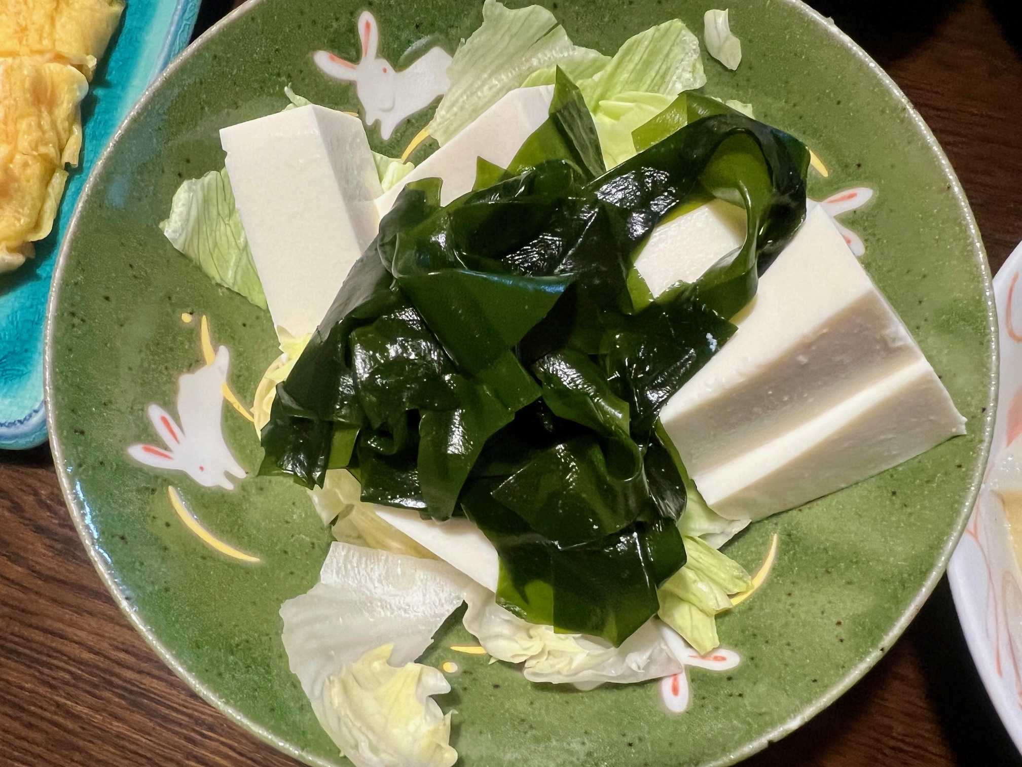 夕食は、海老・木耳・白菜炒め、わかめ・豆腐・レタスサラダ、卵焼き、隠元の味噌汁、りんご。