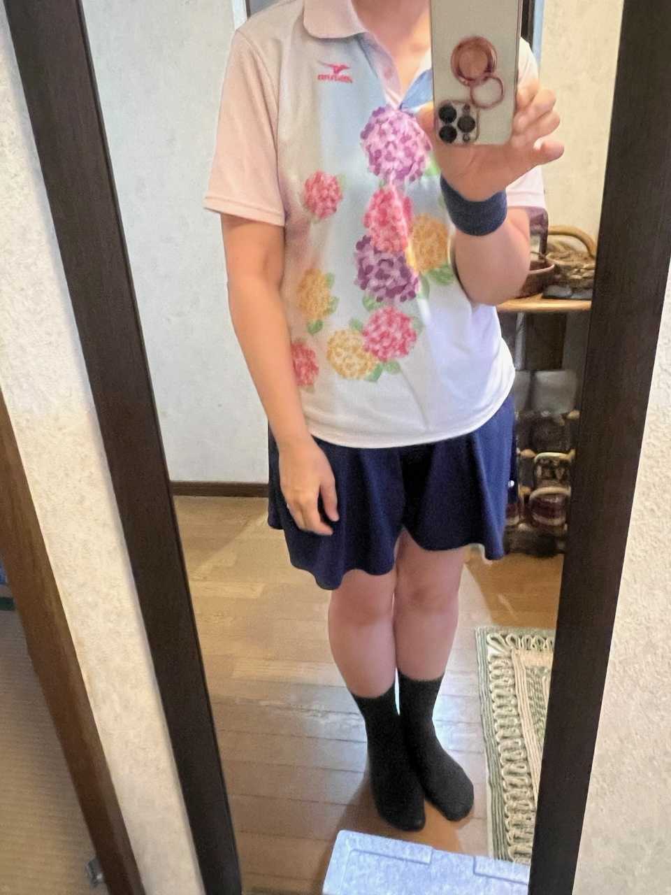 卓球には、ピンクに紫陽花柄の卓球ユニフォーム、紺・ピンクのキュロット、黒靴下、青のストレッチシューズ。