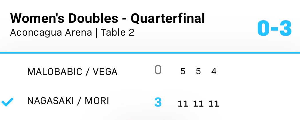 table2 | 女子D-準々決勝 | 長﨑美柚/森さくら 3-0 MALOBABIC/ベガ(クロアチア/チリ)![]() ![]() |