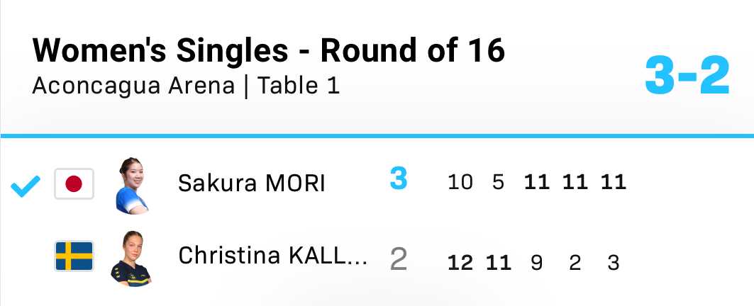 table1 | 女子S-2回戦 | 森さくらWR 50 3-2 クリスティナ・カールバーグ(スウェーデン)WR63 0-2から逆転!床貼り直しで、中継中断してるうちに流れが変わったらしい。 ![]() ![]() |