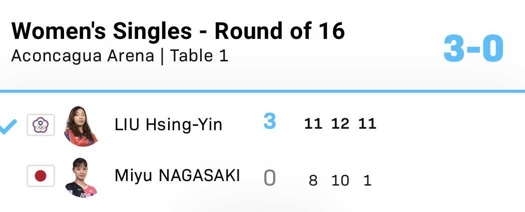 table1 | 女子S-2回戦 | 長﨑美柚WR23 0-3 劉昱昕(台湾)WR67![]() |