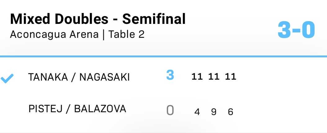 | 1(土)1:00 | table2 | 混合D-準々決勝 | 田中佑汰/長﨑美柚 3-1 ロブレス/シャオ・マリア(スペイン)![]() ![]() |