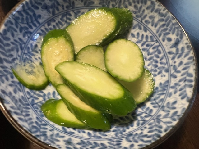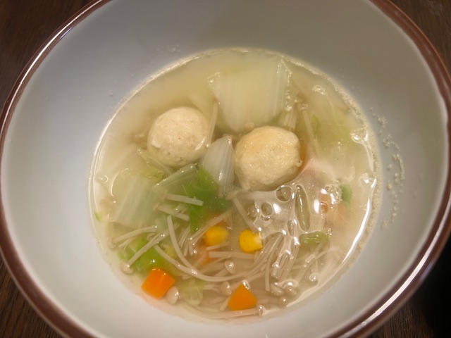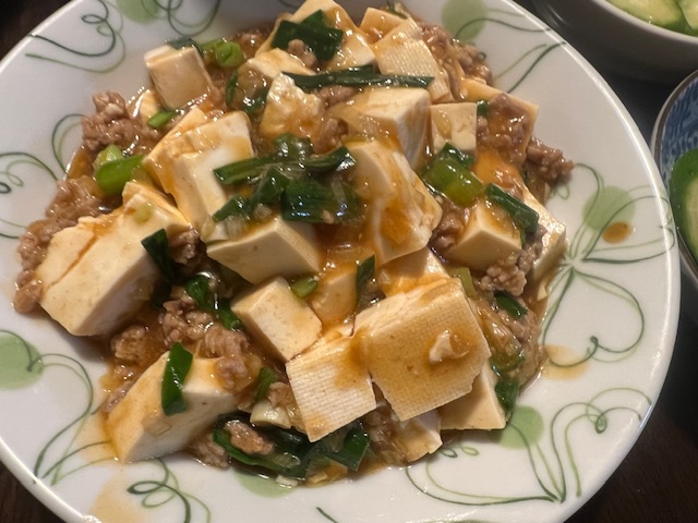 夕食は、麻婆豆腐、胡瓜の糠漬け、海老団子・白菜・えのき・ミックスベジタブル、梨。