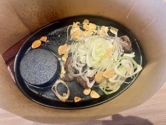 激アツステーキ130g。おすすめトッピングのネギガーリックも。