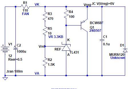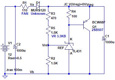 昨日はアプリケーションノート通りの TL431 High-Current Shunt Regulator を作っていた。ある程度は覚悟していたけど、やっぱり発振した。TL431 は別途組み込んでくださいC1 を大きくすればそれなりに安定することは判っている。4.7uF 程度にすれば、発振は止まる。しかし、C1 を大きくする解決方法でよいのか考慮中だ。ちょっと前に改造した電源のファン制御回路に使おうと思っている。ファンの始動トルク不足を解消するため、ファン・ドライブ・トランジスタ HE8050 の CE間の抵抗を低くしたけど、やはり常用時の回転音が大きい。抵抗ではなくツェナーダイオード(の直列接続)かシャント・レギュレータに変える事を考えている。C1 が大きいと万が一でしかないが、CE 間に電流を多く流してしまう可能性が残る。普通は突然 HE8050 が ON 状態になり、C1 を短絡させるることは無いと思う。最終的な目標として、なるべく ツェナーダイオード の様に 2 端子の接続で済み、電流の吐き出しが無く、発振などの不安定動作がない事を考えている。いくつか策は有りそうだけど、1 日寝かせておく事にしよう。