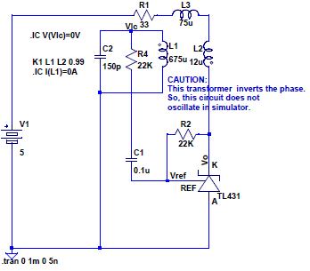 昨日の日記で波形を出した TL431 LC 発振回路だけど、LTSpice シミュレーターでは発振しない回路になった。下は実回路である。実回路はシミュレータで発振しない。どうも、TL431 で位相回転してしまったことをシミュレートしていないようだ。C2 を大きい値 0.01uF にしてみて、位相に余裕を持たせると、示した実回路では逆に発振しない。実回路も L2 の Phase Dot が上に来る回路にする必要がある。シミュレータで発振するトランスの(結合)位相通りだ。L3 は発振波形さえ気にしなければ不要である。Vref に入れていた保護対オードは、不要だった。Verf が TL431 を壊すほどの電圧にならない。ちなみに、コイルとトランスは千石で買った(TDK と札に書かれた)白いトロイダルコアだ。TL431 にとって 500KHz で発振なんてちょっと無理だったらしい。