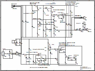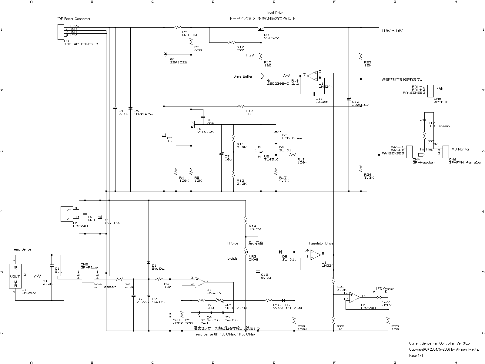 作っていたファンコントローラを PC に組み込んで使用開始した。過電流保護状態で、発振することを確認している。下は使用開始した時点の回路だ。2006/11/1 掲載回路図形式を CE3 (Bsch3V) に変更、コメント修正、回路変更は無い。過電流保護の発振は定電流制御が目的ではないので、安定化は見送った。過電流時の応答性を重視した。下は負荷 5 Ω時、過熱保護も働いた状態で電流制限が掛かっているときの出力 FAN+ 波形である。時間軸: 10uS/DIV, 上: AC 結合, 0.2V/DIV, 下: DC 結合, 1V/DIV になっている。ピークで 280mA 以下、平均は 200mA 以下になる。とは言っても、C7 2.2uF を入れたように少し、発振周期を大きくしている。C7 の悩みは、Q1 2SA1026 の負担になりそうな点もある。一応、電源投入時の過渡状態でも Ic が規格内になりそうなことを確認している。LM35 センサーアンプ周りは整理して、LM358 を使えるようにしたほうが良かった。LED のモニターを付けるなら、ファンと並列に R+LED でよかったと思う。好みで言えば、こういう飾りのモニターの類は派手なメーターよりも、ほんのり輝く LED の明かりの強弱で回転状況を表現するほうがシックリくる。調整は 2 箇所ある。しかし、VR1 1KΩは大体 700 Ω程度、VR2 5KΩB は真ん中 2.5KΩ:2.5KΩ(GND) にして調整なしで使っても問題ない。センサーを放熱フィンに接着した状態で、大体 50 度(マザーボードのモニタの値、高めかも知れないけど)で落ち着く。組み込んだ後に、基板の全景を撮っていなかったことに気付く、送り出す前に、しっかり顔を見てやれば良かった。