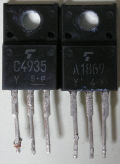 組み立てを再開した基板(ちょっとしたアンプ)の動作実験中に出力トランジスタ 2SC4935, 2SA1869 を昇天させてしまった。本当は昇天させる前に色々と手を打っておくべきだった。2SC4935 の方は B-E 間オープン(B-C 間はダイオード特性は維持)、2SA1869 の方は B-E 間 オープン、B-C 間ショートだった。回路の問題はアイドル電流過多なのだけど、色々と実験設備側も問題が有った。手製電源の出力が過熱で保護状態になり、電圧が降下したのは判ったけど、それを表示していないため、回路の失敗かどうか判断できなかった。電源を安定化前の回路から取り出して、保護なしで供給した。そもそも、間違いだ。回路の特性変化で発振状態になり、激しく発熱した。基本的なことだけど、アンプの初めての火入れは、アイドル電流をほぼ 0 に絞って、位相補償を十分にして、電源電圧もやや低めで、いきなりフルパワー状態にはしないということを分かっていなかった。手製電源じゃなくて、本格的なのやっぱり必要かなぁ。あっ、電池で十分か。