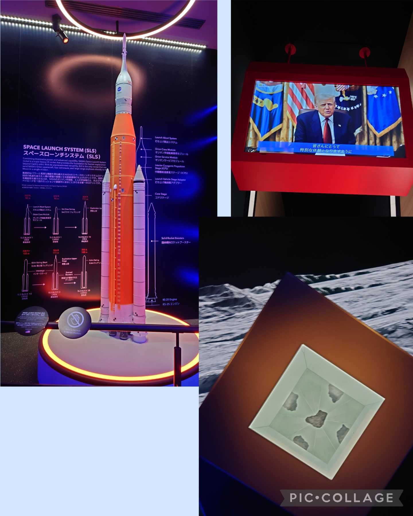 館内では宇宙に関する展示があったり、一番最後には月の石の展示(写真右下)も。