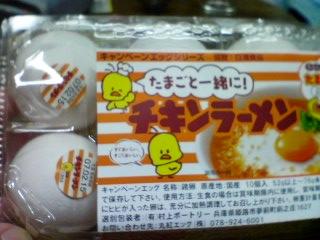 こんなん見つけたよ♪d(⌒〇⌒)b♪キャンペーンエッグ(日清食品 協賛)だって。ダイエーで、買いました。チキンラーメンと一緒にどうぞ…なかなか可愛いでしょヽ(´∇`)ノパッケージに書いてあったんですが、チーズを乗せてみるのも、おいしいですよ。たまごポケットに生卵を入れて、スライスチーズをちぎって、周りに乗せて、お湯をかけます。とろっとしたチーズが、なかなかいけるらしいです。お試しあれ…(⌒¬⌒*)んまそ・・・♪