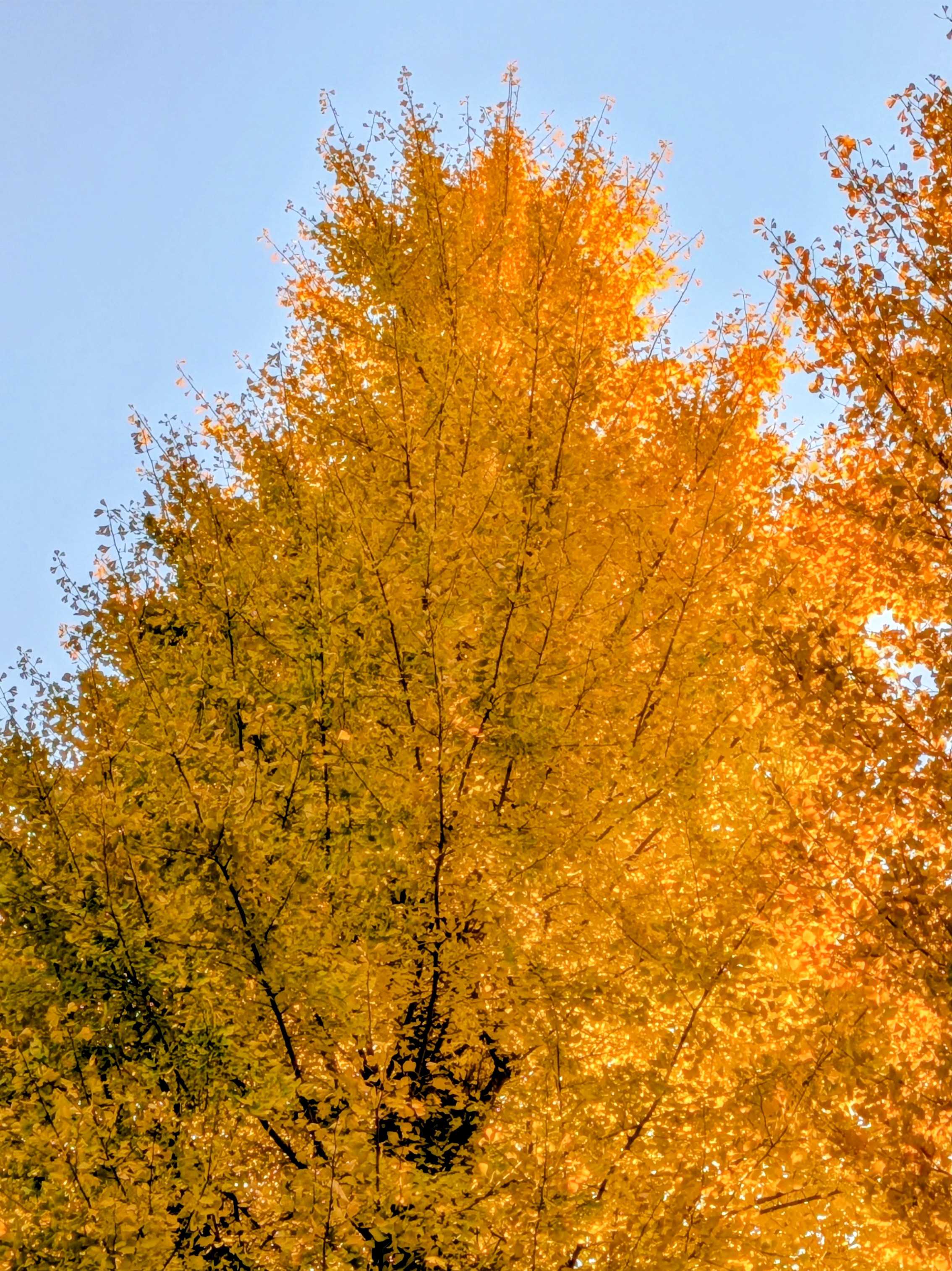 いつもの散歩コースの大学校内の銀杏いい色になってきましたちょうど西日が当たって先端…