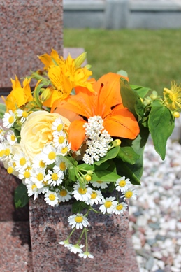 雲行きが怪しく・・・・。午前中の晴れから曇天少し雨が。6月の納骨以来の7月のお墓参りでした。庭の花でまとめて献花を。 義父母と仲良くお骨で収まって・・・お墓を前に気分は何だか照れくさいような。お骨が増えて賑やかなお墓の中です。食事をするように、朝、顔を洗うように月1でお墓参りを。 肉体が無い人達に、献花して、聖書と歌と感謝と祈りを。静かな霊園でお墓参りに見える遺族ポツリ、ポツリ。法要の遺族の姿も写り。そして、再び日常へ。 普通がいちばんを二人で話していたことも懐かしく。生きられなかった人の思いを忘れずに。普通に風景を見てる私に時の流れを思います。教会にも献花を持って行きました。 7月も短く感じます。大切な時間、1日です。祝福の7月でありますように。