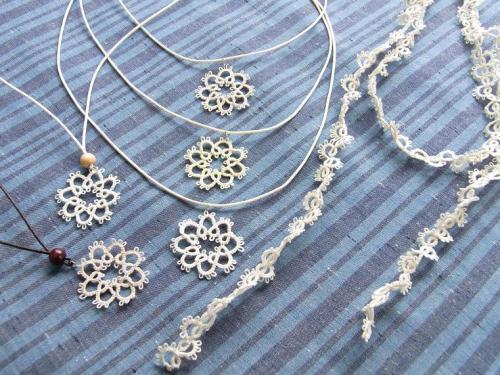 最近の私 夜な夜なチクチクちくちく あれもしたい これもしたいと定まらず ちょっとぶれています(笑) まぁ針はもっているのですが^m^ ブログの更新は サクサクとできる方ではないので ちくちく優先となると あっというまにひと月たってしまいます そして今は… 10日ほど前 手芸屋さんで『タティングレース』のアクセサリーを作るキットを見つけまして! …作りたいなぁと☆ こぎん刺しのちくちくを中断 作り方説明の紙とにらめっこして まずは太めのコットンレース糸(100えんの)で練習をしました …手つきがぎこちないです(汗) ちょっと上手に編めたので細めの糸を使い… まぁまぁでしょ^m^ 他のデザインも編みたくなったので 先日本を買ってきました! ん~~寄り道が長くなりそう=3 実は日本の伝統木綿も気になっていて お土産なのか 家にあった伊予絣で手提げを手縫いしました あと木綿で春夏ワンピを作りたいなぁなんて^^ アイヌ刺繍もしたいし 和模様のクロスステッチだってチクチクしたい 少しずつ 少しずつ いろんな挑戦してみたい^^ ん~どれから!? そして 母の初めてのこぎん刺し バネポーチと携帯ケース 母娘逆転 私が先生です(笑) 眼鏡をかけて 楽しくちくちく 結構 頭も使うんですよ! バネポーチをたくさん作ってお友達にプレゼントすると張り切っています☆