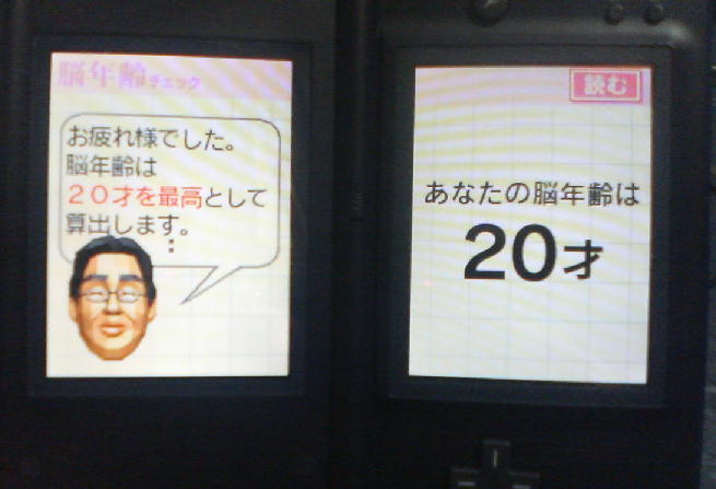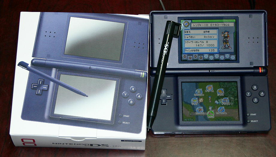 昨日JUSCOに行ったとき任天堂DSの前のモデルが並んでいた。あっという間になくなってしまったが、入荷したんだろう。子供と買う約束していたので今日は近所のJUSCOに開店から行ってみた。いろいろな掲示板をみると都内の電気量販店には200台とか入荷したって書いてある。任天堂のHPをみると55万台出荷と書いてあるのでここにもあるだろうと思った。すると答えは「今のところいつはいるかわかりません」とのご回答。残念と思いつつも買えなかった怨念だけ残る・・・。あきらめきれないので昨日行ったJUSCOに電話して聞いてみることにした。だめで元々である。すると「何時になるかわかりませんが今日入ります」とのこと。「色も数量も全くわかりませんのでご了承ください」だって。チャンスがでてきたぞ。よし行こう!片道1時間半ほどだがまた行くことにした。2日連続遠いJUSCOだ。着いてから聞いてみるとまだ入荷してないとのことだったので、子供用の携帯を購入。ボーダフォン 803Tだ。3Gで音楽プレーヤー付きで安いものがこれしかなかった。今自分が使ってる携帯よりもいいが・・・。JUSCOの商品券ももらえたし、まぁよかったです。携帯の購入が終わり、ゲームコーナーに行くとなにやら慌ただしくなってきた。カートに段ボールが山積みになってきた。整理券を配ったりしないで売り場に空箱を置くとのことだったので、売り場で一人寂しく待っていると、JUSCOの店員が近寄ってきて入荷いたしましたのでレジまでどうぞと丁寧に呼びに来てくれた。ネイビーをゲットです。かなりの数量があったが他の買い物をして戻ると水色が3個残っているだけだった。家に着いてから早速試しにやってみた。子供達を両脇に従えてトライ。液晶のバックライトが眩しいくらい。きれいに映る。これで子供達がポケモンレンジャーをやりながら私は脳年齢チェックができる。