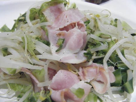 もやしとベーコンをコンソメと塩コショウで炒めた