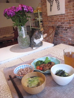 この日は無性に和食が食べたくなり、冷蔵庫にあった物で、夕食を作りました。トレーダージョーズで買った、冷凍ミートボールがあったので炒めた後、みりんとしょうゆを絡めて照り焼き風に。そして家で作ってるキュウリを取ってきて、ワカメと酢の物にし、後は玄米&雑穀のご飯と味噌汁で。はい、出来上がり~~。けっこうある物だけで、何とかなるもんでしょ♪久し振りの和食、美味しくいただきまいた。