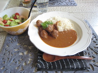 友達が3人、うちに遊びに来てくれた日のランチメニューです。国籍も、味の好みも異なる3人。さてさて何を作ろうか………;と考えて、以前おもてなしで好評だった、インディアンミートボールに決定!これなら、前の日に作っておいて、前日はサフランとチキンスープで炊いたご飯を用意するだけという簡単さ!デザートは、友達が持ってきてくれたギリシャカフェのスイーツです♪コーヒーと一緒に、満足、満足……