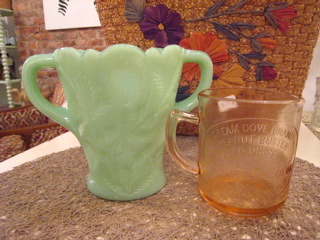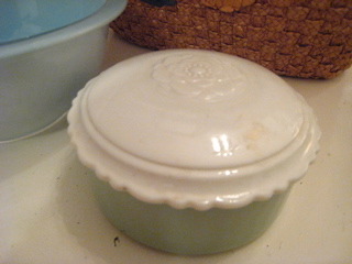 そしてお次は、山の中の一軒家のヤードセール。本当に、車なんかあんまり通らないような山奥のお家でその日のお客さんは、きっと私達だけだったのでは…………??ここで、すごい掘出し物を見つけちゃいました!!ミルクグラスのジュエリーボックス。下の部分がジェダイで、蓋が白。蓋の部分には、薔薇の模様が彫られています。これ、どうやらファイヤキーングの物のようで、家に帰ってからネットで調べたら色違いのピンク(ダスティーローズ)で、全く同じ物が、12000円で売られていました!!ちなみに、底にはフアイヤーキングの刻印はありません。そして左に写ってるのが、パイレックスの小さなボールなんですが外側が透明感のない水色で、中の部分が透明なクリアグラスという、ちょっと珍しいもの。後ろのバッグは色褪せた感じが気に入って、買ってみました。これだけ買って全部で$6恐ろしいくらい、あり得ない値段ですね…………。