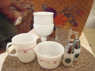 最終日に、最初に立ち寄った、サルベーションアーミーにて。さすがにここは田舎だけあって、店舗も大きかった!食器のコーナーには、コーニング社のマグカップとか、お皿がゴロゴロしていました。そういえば、今回お世話になった,友達のご両親のおうちでも、お姉さんのおうちでもコーニングのお皿が使われていて、『ああ、みんな使ってるんだ!!』って嬉しくなっちゃったんですが、後で聞いたら、ここにコーニング社の工場がある事が判明!!なるほどね、だからスリフトショップにもいっぱいある訳だ!ここでの戦利品は……………手前のカップ2つは、コーニング社のもの。白いミルクグラスのワイングラスは以前、黒いミルクグラスのワイングラスを日記で紹介したんですが、覚えてますか?あれと全くいっしょで、色違い、サイズ違いの物です。そして後ろに写ってる透明なグラスマグは、何とマクドナルドのノベルティーマグで全体にバットマンの模様が入っている、とってもレアな物♪ここでもビックリプライスでお買い物ができましたよ~~。みなさん、予想してみて下さい!全部で確か、6~7ドルでした♪