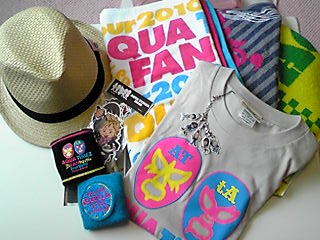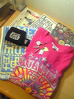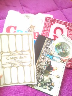 ちょっと更新空いちゃった(∵)久しぶりに写メ載せます!Aqua Timezのライブのグッズ↑Tシャツ・タオル・ツアーパンフレット・ストラップステッカー・カレンダーですほんとはリストバンドもあるんだけど、写メ撮るの忘れた(;_;)Tシャツはね~ファンクラブ限定のもあったんだけどこっちの方が色もピンクでかわいいし、これにした↑トートバッグ表と裏♪ツアーグッズ入れにしてたよ♪めっちゃかわいい↑缶バッチ!今回はめっちゃかぶっちゃった~><これはかぶってないやつを写メったんだけど・・・。でもこれも良い思い出だ~かぶったやつは、学校のカバンにつけよっとじゃっ☆