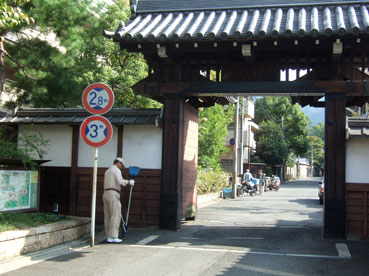 写真:南禅寺惣門。振り売りの八百屋さんに近所の人が集まっている。高級マンションの用務員さんが赤いハッパをササッとちり取りの中へはきこんだ