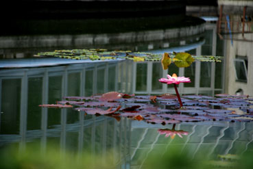 水盤の飛び石を超えて、彫刻の横をぬけて