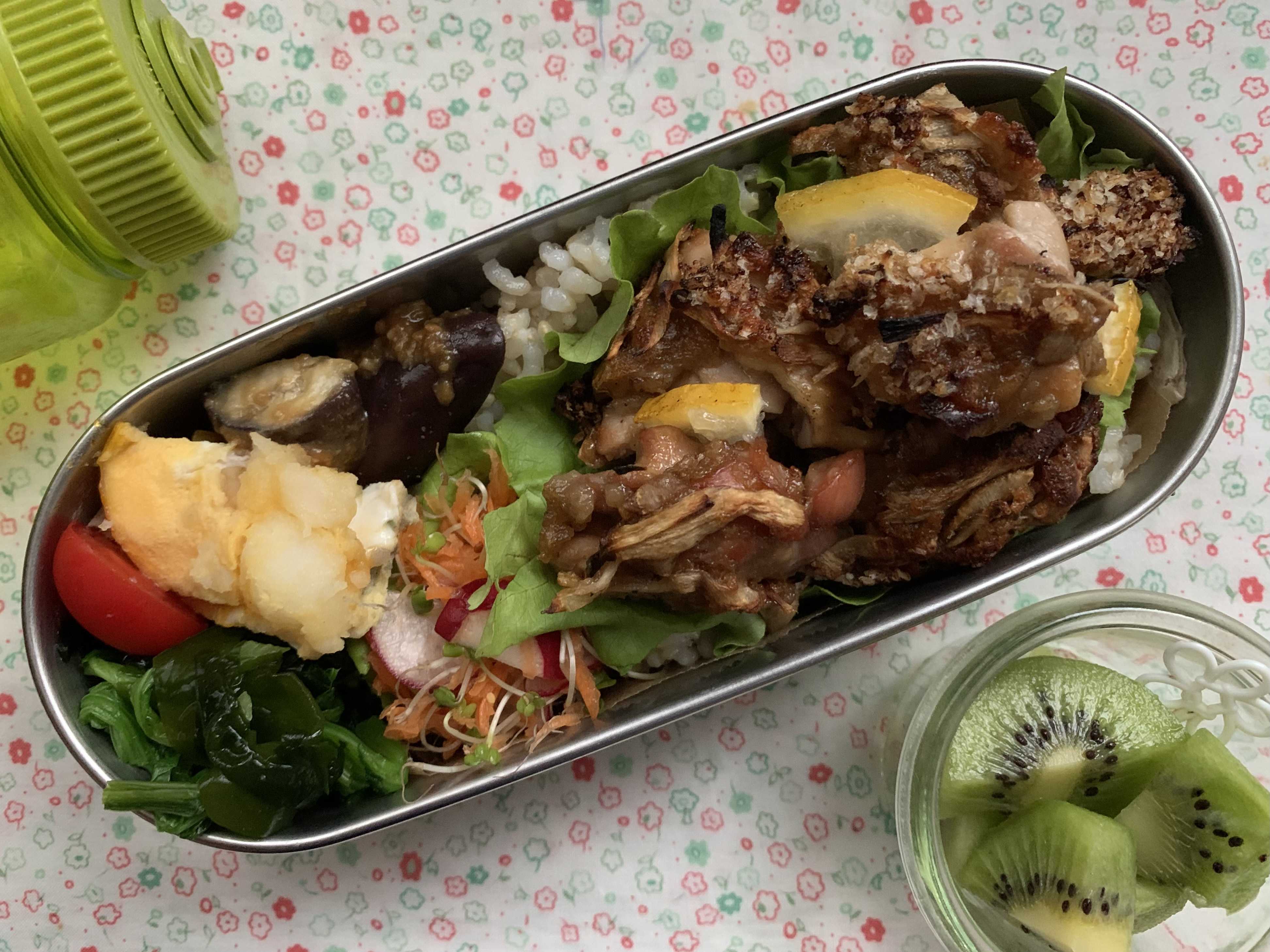久しぶりに午前中は小雨が降り続き、午後を過ぎたら止んだけれど、なかなか寒くなってきた日。 今日のお弁当は・・・鶏ゴボ唐揚げ、ラディッシュのラペ、ナスのゴマ味噌和え、ポテト入り卵焼き、ほうれん草とワカメのナムル、プチトマトとおまけのキウイ。唐揚げは、とりのモモ肉を一口大にカットして、あらかじめ醤油+みりん+酒+しょうがパウダーに浸けておき、そこにささがきにしたゴボウと溶き卵、米粉で作ったパン粉を加えてしっかり絡ませたら、魚焼きグリルの弱火でじっくり焼きました。スライスしたレモンを飾って出来上がり♪ ノンフライでもとっても美味しく出来てやみつきです\楽天ランキング1位獲得!/ 米粉 お米のパン粉 粗目 400g(200g×2) 送料無料 小麦不使用 国産 無添加 アレルゲン不使用←ちょっとお高めだけれど、粗めで凄くさくさくしていて、唐揚げがとっても美味しく出来ます!←いつも見ていただいてありがとうございます。ブログ村のランキングに参加しています。四毒抜きのすすめ 小麦・植物油・乳製品・甘いものが体を壊す [ 吉野敏明 ]←こちらの本を熟読中。病気の原因は食事であることが多いという内容! YouTubeもとても興味深く、病気の原因、医療、政治などなど、凄く博識で勉強になります。毎日、配信!なので、毎日、楽しみ♪2019年度産新米 有機米・熊本コシヒカリ 玄米(5kg)【ムソー】
