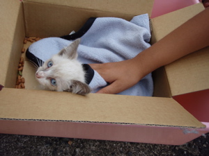 今日の夕方PCをいじっていると何やら外が騒がしいちょうど小学生の下校時刻だったので集団下校かなと思っていたら「き~ちゃん(ママのあだ名です・笑)」って小学生に呼ばれました何かなと思って外に出たら側溝の蓋の下で子猫が鳴いているから助けてあげてとのこと小学生達と救出したのがこの子青い瞳の可愛い子猫でも、生まれつきなのか下半身不随前の手だけで歩こうとしてました…とりあえず毛布で包んでお腹を空かせているみたいだったのでニャンズのご飯をお裾分け始めは震えていましたが上手に手から食べてくれました小学生数名、どうしようかとの話し合いの末一人の女の子がお家に連れて帰る事にもう少し大きな段ボールに新聞紙をちぎって入れてあげ、帰る頃には疲れたのかニャンコはウトウトその後シンデレラみたいな目をしているのでデーラちゃんって名付けたのって報告しに来てくれました自然界だったらきっと長くは生きられない体優しいお姉ちゃん達に巡り会えてよかったね^0^ピンクのハイビスカス