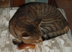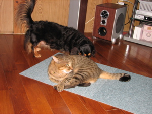 南の島は今日も雨さすがに雨が降ると涼しく感じますといっても、まだ半袖素足なんですけどね(笑)そんな気候なので絨毯?を2枚出してみましたそうすると先ず陣取ったのは甘えん坊のミャアそこにやって来たのはソラミ母さんミャア、一人で良いところに寝てるわね~ byソラミそれなら、こっちの絨毯には私が乗るわ byソラミとでも言っていたのかな蹄を持っておしゃぶり始めましたでも、微妙な距離を保っているでしょう(笑)ヤブランの花
