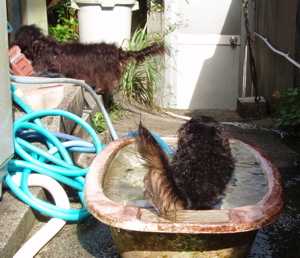 今日からパパは大阪出張です難波で行われるふるさと回帰フェアにいますので暇な人は冷やかしに行って見てね^0^今、スローライフが話題になっているのでこの町でも定住促進を呼びかけています来週には定住促進ツアーも行われますまたおいおいアップして行きますねそんなこんなでこの4日間はママはのんびり(ママのお仕事はあるけれどね~一番手の焼けるのが不在だもの♪)早速ワンズとボール遊びに興じたら翼にボールを取られちゃったからちょこっと休憩して行きましょう byソラミう~ん、いい水だわ♪ byソラミってそれ雨水ためている桶なんですけど…まだまだ水に飛び込みたくなる南の島です