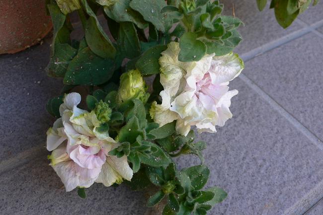 梅雨に入ったらしいのですが・・・こちらでは雨が殆ど降ってません。ダムの貯水率も日に日に下がってきているようで雨の降らない空梅雨になりそうな感じです。なので・・・お花の水遣りに苦労してますっ今日も仕事から帰ったら、クタ~となってました 昨日はお休みだったので園芸店に行って来ましたハガキが来ていて、10%~70%offと書いてあったので、つい・・・。結局コリウスとマリーゴールド、それから20%offのプラ鉢を購入しました。あ・・・それからこの白いお花も↓ 良く聞く名前なんだけど・・・完全にど忘れです後ろには種採りをまっているニゲラがいます。 コリウスを3つお持ち帰りしたんだけど・・・。ブランド苗ってどうしてあんなにお高いんでしょうね。私はいつものごとく98円のタグ無しコリウスちゃんをお迎えしました以前南花壇のメチャ陽当たりの良い場所に植えて発色が今イチだったのを教訓に今年は玄関ポーチの日陰で育ててみようかと思います。 こちらはお日様大好き「サンパラソル」ですツル性のを購入したのでどうしたものかと思い悩んだ挙げ句鉢代節約の為にバラ鉢に植えちゃいました。あぁ、でもまだトレリス用意してないし~クッタリと垂れて咲いていたので、持ち上げてパチリどの位のボリュームに育つのか楽しみだわ 最後にヘリテージさん。 今朝撮った写真ですが、仕事から帰ったらもう散ってました。花の命は短いのね~ 去年はもっと沢山咲いてくれてたような気がするんだけど・・・やっぱりコガネの幼虫にやられたのが悪かったのかなあまり成長がみられないです。今年はプチトリアノンとティネケがコガネの幼虫被害をうけているような・・・今度土中の幼虫にも効くオルトランを撒いてみようっと。 あ・・・皆さんお風邪には気を付けてくださいね。私も大丈夫だと思っていたら、思いっきり喉に来る風邪をひいてしまいました。咳が中途半端に長期間出るので今は肺が痛いです。おまけに耳の奥が痛くて、食べ物が飲み込めません明日は幼稚園の参観日だというのに、体調がイマイチでブルーですわ。取り敢えず今からお昼寝して体力回復を目指します