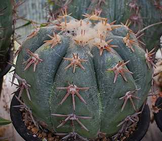 ガマンマのニク・サボ栽培にようこそ ^^8月22日(金)晴、25~37℃、湿度49%。23日は晴後曇で降水確率は昼過ぎ40%。 24日も降水確率は高いので一雨ほしい。本日は、ギムノ・モンビレーや聖王丸、アガベ・パープソラムほか・・にほんブログ村ギムノ・モンビレー(Gymnocalycium monvillei)刺座が赤い多花玉の黄刺変種の金碧(G. multiflorum v. albispinum)と酷似して区別が難しい。ギムノ・モンビレー強刺の海王丸作出で交配親に使われるギムノ・聖王丸(Gymnocalycium buenekeri)黄緑肌で5稜形、6稜短刺はペンタカンサギムノ・4稜聖王丸錦4稜の鮮明斑入り種だったのが増稜して、斑も不鮮明に成った。ステノカクタス・千波万波(Stenocactus multicostatus)アレオーレの綿毛がふわふわで可愛い千波万波 タイ輸入苗国内産苗は黄色針状刺で肌も黄色っぽくやたら稜数多い。---------------アガベ・パープソラム(Agave purpusorum)和名=帝釈天シャープな刃先に黒刺と葉縁の歯牙が恰好良い。パープソラム 実生苗------------------ご覧いただきありがとうございます。よかったらポチお願いします。 にほんブログ村 多肉植物ランキング #多肉植物