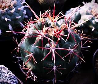 ガマンマのニク・サボ栽培にようこそ ^^8月21日(木)晴、26~37℃、湿度43%。22日も晴れて37℃に、23日も37℃、降水 確率40%だが・・・本日は、テロカクタス・紅鷹、天興、緋冠竜他に、ギムノ・黒刺鳳頭などの様子です。にほんブログ村テロカクタス・紅鷹(Theiocactus heteromus)ツートンカラーの中刺が長いタイプ紅鷹 赤いグラデーション刺が特徴紫紅花の超美花種。テロカクタス・天晃(Thelocactus hexaedrophorus)キリン団扇接ぎ下ろしの天晃(左)と長刺変種の緋冠竜。テロカクタス・緋冠竜(T. hexaedrophorus var.fossulatus)湾曲した赤い刺が荒々しい、花は純白。紅鷹緋冠竜 自家産交配実生刺はそれなりで両種の中間形、花は桃花----------------ギムノ・黒刺鳳頭(Gymnocalycium asterium)タイ輸入苗を入手。黒刺鳳頭均整のとれた扁平球に黒刺の短刺------------------ご覧いただきありがとうございます。よかったらポチお願いします。 にほんブログ村 多肉植物ランキング #多肉植物