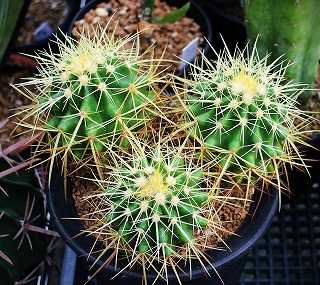 ガマンマのニク・サボ栽培にようこそ ^^8月26日(火)晴、25~36℃、湿度58%。27日は晴で前線の影響無く晴れて36℃の 猛暑日に28日も同様に36℃。本日は、サボテンの王様の金鯱と金鯱の変異種とモンスト種ほか。にほんブログ村エキノカクタス・金鯱(Echinocactus grusonii)3頭苗白刺金鯱(E. grusonii var. albispinus)王道の黄色刺種の変異種。サカテカス金鯱元の産地から500km離れたサカテカス州で発見された、新産地の金鯱。小さい時期は刺が長いのが特徴。短刺金鯱(プラチナ金鯱)通常の金鯱と比べて刺が短く密集鷲刺金鯱 短刺金鯱の中でも特に刺太く少し湾曲した刺を出す狂刺金鯱 不規則に暴れた湾曲した刺が荒れ狂う変異種金鯱モンスト(金鯱の泉)(Echinocactus grusonii f. monst)子吹き性のモンスト金鯱モンスト 金鯱の泉 掻き子の自根苗。------------------ご覧いただきありがとうございます。よかったらポチお願いします。 にほんブログ村 多肉植物ランキング #多肉植物