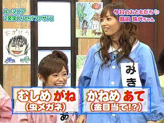 どうも!!やてきましたよ!!今日は、GAMの新曲発売日!!でも・・、雨。ま、いいですけどね。なぜ、2日間もブログをやんなかったのかと言うと 放置プレイしてみました!!まぁ、どっかの誰かさんがMなんで(マテッできなかったみたいなので、私がやってみました。どうでした?寂しかった?さて、今日のタイトル「日曜日」次は、「び」!!「なぜ、日曜日?」って思う人がいると思うので一応言っておきます。10月1日は、運動会!!あ、私の学校でなんでくれぐれも、間違えないように。あぁ、いやだなー。しりとりといえば、ハロモニ。!!もう、水曜日なのでね!!はい、こちら!!今週のゲストは、たまよちゃんなので美貴ちゃんが「見たい!」って言ってます。もちろん、それに答えてくれる、たまよちゃん。私は、ボインちゃんダンスって何?って思ってたら何を言ってるの?美貴ちゃん!!まぁ、岡やんはボインですけど・・・。その画像ないんです。私、一人で大爆笑。普通に床で転がってましたもん私。(笑)美貴ちゃんも岡やんのボインちゃんダンスで、爆笑!!さすが、岡やんです。岡やんは、関西の人なのですごくノリがGOOD最高です。今日は、頑張って2回更新してみます。だって、GAMの感想言いたいじゃん!!ハロモニ。だって伝えたいじゃん!!>コロリさん10日遅れってどんだけですか!!>デンビーさんそうなんですよ!!9月10日は、「ミキティ デイ」でしたよ!!なのでみなさん、9月10日は、「ミキティ デイ」って覚えましょう!!>お兄ちゃん、デンビーさん人のサイトで喧嘩しないで下さいね!!
