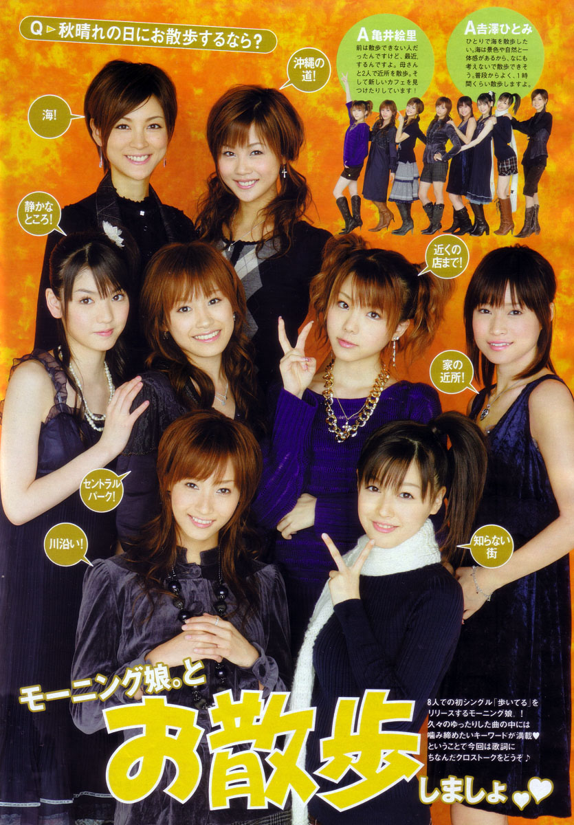 TVガイドに娘。が出てたんで紹介します。(遅いなwwモーニング娘。とお散歩しましょ(ハァト×2えりりん:家の近所!前は散歩できない人だったんですけど、最近,するんですよ。母さんと2人で近所を散歩。そして新しいカフェを見つけたりしています!よっちゃん:海!一人で海を散歩したい。海は景色や自然と一体感があるから、なにも考えないで散歩できそう。普段からよく、1時間くらい散歩しますよ。がきさん:沖縄の道!子供の頃、沖縄のおじいちゃんとおばあちゃんと一緒に、のほほんと歩いた海までの道。景色も沖縄独特で全然違ってて、和む時間でした。さゆ:静かなところ!静かなところを、のんびりと歩きたいなぁ。散歩する時は、ひとりでいいです。なんにも考えずに、ぼ~っと2~3時間くらい歩いていたいな。あいちゃん:セントラルパーク!今、NYをテーマにした本を読んでるので、セントラルパークで散歩したい。すごく広いイメージだから、ひとりで音楽聴きながら歩きたいな。れいにゃ:近くの店まで!ママと一緒に、遠い距離にあるお店まで、あえて歩いていますね。ママとは友達みたいに仲がいいから、そういう時にすごい語るんですよ♪こはる:知らない街自分の知らないところを探検したい。小春、近道とか見つけるのが得意なんです。あと、夏の涼しい夜に友達としゃべりながら歩きたい!みきちゃん:川沿い!水もあって緑もあるから、川沿いかな。気も落ち着くしゆったり散歩したい。普段は散歩しないけど、天気がいいとしたいな!って思います。いわれて嬉しい誉め言葉は?(藤本美貴×高橋愛)藤本:私は、私の存在を全部受け止める方がいいかな。 「なんかいいね。」とか。高橋:私はトークが苦手なので「ちゃんとしゃべれたね」とかかな。 事務所の人に歌収録やラジオ出演の際に「たくさん話すんだよ!」って言われるんで。藤本:それはプレッシャーを与えないためなんじゃない?高橋:そうかな。 今明石家さんまさんとラジオやってるから、しゃべりも鍛えられてると思う。藤本:さんまさんに「お、ええやん!」って言ってもらえると嬉しいよね~。 ダメ出しされる方が多いから、たまに褒められるとホッとする。高橋:そう、嬉しいというよりホッとするんだよね(笑)。なんか、まともwこれからこれでいこう☆カナ?