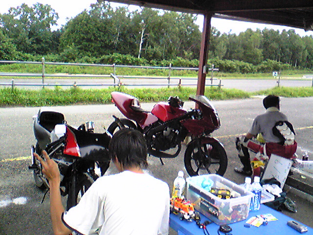 ども~!最近日曜は毛○峠に行くというのが習慣になっている管理人です!まぁそのために平日がんばって生活しているんですけどもね!今日はすごっかったですよ!我々の先輩の走り屋さん達が大集合しました!夏本番も近づいてきてだんだん台数が増えつつあります!!早朝の展望台のあの風景はいいですね!バイクがずら~っと並んで!最高です!!で、一通り走り終わったころに雨が降ってまいりまして、解散!まぁ結構走れたんで満足かなという感じです!家帰ってまずしたことといえば。。。睡眠です!!やっぱり寝ないともたないんですわ~(^^;)で数時間ねておきて、ガンマを2個1で仕上げる作業に取り掛かりました!まず、事故ったほうのフレームにエンジンを載せて、オーバーホール済みのフロントフォークを入れてその他部品を移植して、中途半端なところで夕暮れ!昼間寝ないでやればよかった(TT)まぁ今週中に2個1を完成させます!!来週もバイト&学校がんばって日曜早朝毛○だ~!!