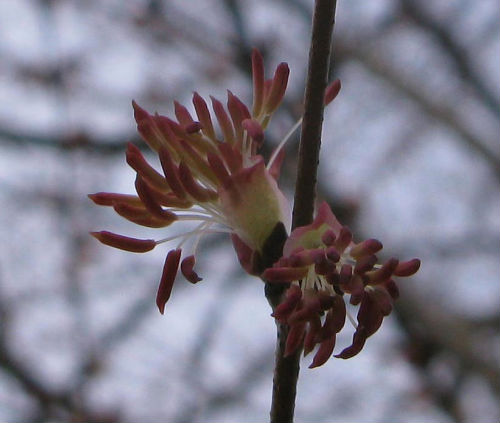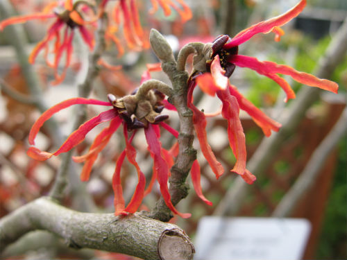 赤いのは違うマンサクなのかと思いましたが、日本原産の普通の黄色のと同じ学名です・・→http://hana.karakusamon.com/mansaku.html
