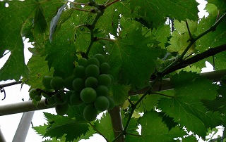 こころのところ、成長が止まってしまった感あり相変わらず、固い。。。色も変化する気配なし。。。スーパーで見たあの巨峰色(?)のぶどうにするためには、やはり、袋かけが不可欠かもしれない・・・ためしに、本日三つだけやってみました
