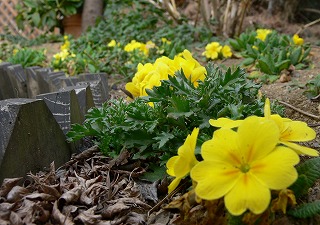 玄関前の寄せ植えは、今年も黄色のパンジーです。なんだか、元気もらえそうな気がするし・・・。それに、玄関に黄色のものを置くのって、縁起がイイんじゃなかったっけ