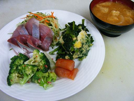 エンジンが掛からーん!一昨日くらいからセルの係り具合がおかしかったのですが仕事終わって店から帰ろうとしてセルボタン押しても うんともすんとも言わないえー! おーい! もしもしもしー!バッテリー死んじゃったの?キックしてみたらエンジン掛かりまして・・・おー 助かった!なんとか帰って参りました途中で止まったら如何しようかと思いましたよと言う事で 9時に修理屋さんに行くのですが其れまで酒が飲めん・・・ くっすんそれにしても バッテリーって2年できっちりイカレルって凄くない!車に乗っている時も毎日乗るのですが本当に量ったように2年でオシャカになってある意味感心してしまいましたが・・やっぱり日曜日という事で店は暇で御座いました めでたしめでたし!怒られそうですが・・・ てへっ!昨日買っておいたハマチ〆て置いたのですが〆はまちの刺身 菜花の卵とじ ブロッコリースィーートチリマヨ和えお零れの辛し明太子言っても仕方無いけれど 1プレートってのがなー!玉葱と薄揚げの味噌汁明太子が一番高いのですが・・・福太郎 博多から送られてくるのは何時も此れでした(博多っ子は此れが一番旨いと言います)ラッキー!本当はプリン体の塊なので怖いんですがめったにご馳に為れないものは我慢すると却って体に悪い?言い訳ですけど・・・其れと勿論Pは刺身食べませんからPー飯毎度世話の焼ける奴だぜ生喰わないから明太子も無し嫌味の様に野菜だらけだけど食べるかな?日本の朝食は此れだぜ!(朝食じゃ無いってば!)其れと此れは大きな内緒なんですがこんなん作ってしまいました棒寿司持って帰ってしまいましたこれって業務上横領?皆知ってますけどこの切った分は食べてしまいましたえへへ 美味しかったよー!自分だけで御免ね(誰に言うとん?)残りは明日帰ってから酒のつまみにしよう! うん