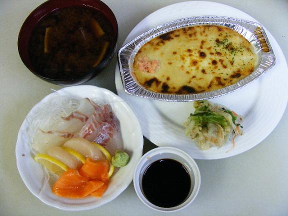 毎日落ちるのが日課?結構な時間が経っていてカンブリア宮殿見てた所までは・・・・・・・・其の後何も覚えてな~い!是ではビデオ摂って置く意味がねー・・・・・は~深夜アニメだけ又巻き戻して観ておりますが(アニメ好き)今日は暇でした椅子に座って居眠りしてしまう位暇でした わ~い!(怒られる?)そんな毎日毎日忙しかったら蔵が建っちゃうじゃんね!・と言う事は関係なく矢張り賄いに意欲が湧いて来ない小父さんなのだった都合よく出来合いに良いのが有ったりするんだな これが 究極の手抜きだんな出来合いグラタン に 刺身 何故だか白菜の漬物予算はちょいとオーバー気味ですがこのグラタン安い割には結構いけるので有れば買います(118円)それにしても白身の鱸(すずき)が甘くておいしかった~!冬は何故だか安いんですよ?又あったら買っちゃお~!!!!!