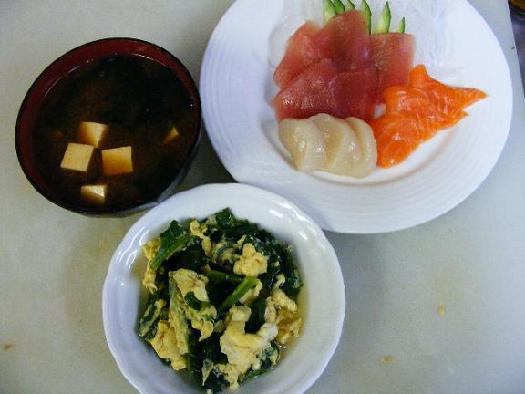 縫ったところがひきつれる感じで 鬱陶しいので自分で抜糸してしまいました爽快ですよ~ん!怪我ってのは日にち薬ですからほっときゃ治る!・今日は記録的に暇キッチン内に椅子持ってきて座っているうちに居眠りしてしまった・・・・・・・こんな事ははじめてですよ(居眠りが)然し11時半から来店客0というのは勤め始めてから初体験其の侭終ってしまいましたがな2時過ぎにはお客さん1人だけ全ての女の子が其処に行ってドリンク一杯づつ貰っていたけどそれだけで2万5千円だっせおー怖!それでもそんな事が嬉しいのかね~!上機嫌だったダウばっかじゃないの!帰るに帰られず困ったというのじゃないそうで自分から女の子に振舞ったって言うのだから呆れ却って物も言えない昨日も書いた毎日来る爺です私には 訳 判ん~め~?今日の賄いは盛り刺し菜の花卵とじ暇な割にはシンプルメニューです自分のだけ寿司飯で丼に少し余った刺身は握りで食べちゃいました手が酢飯で汚れていたので写真は撮れませんでした