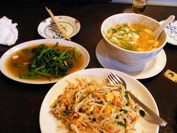 この店に私を紹介して呉れた知人がおう タイは如何だった?とのたまうので早速タイ料理店「バンコク」で報告会小父さん二人での会食ってのも色気が有りませんが一週間ぶりのタイ料理ちょっと嬉しい!タイで料理写真撮らずに名古屋で撮る・・・・・・・怪我の功名?毎度おなじみの パットパックブン(空芯菜炒め)パッタイスギー(タイすき焼)お味はかなり宜し尤もタイ人コックが作っているんだから味が変な訳は有りませぬ!尤もわざわざ日本までへぼ連れて来る訳は無い?うー バイクだから酒が飲めないのが辛い!いっそ置いて帰ろうか!なんて思いましたが(雨が降っていたし・・・・・・)しかし明日の出勤考えるとそういう訳にも行かないし(出勤途中に買出し有り)小一時間話してましたが酒が無いと話弾まな~い尤も思い出話なんて もうブログに書いて居るので蒸し返しに熱が入る訳も無いですよね・就寝中に携帯が鳴って弟こちらに来るダウ勘弁してよ私には真夜中だっちゅーの!ベンジャロン焼きが直ぐに見たいダウあはは そういえば携帯が無かったので何度掛けても出なかった訳だからやきもきしていたのかも?三つのカップを貯めつ眇めつしながらあんたはどれが良い?とかきくのではい?・・・・一つ呉れるダウ!わーお太っ腹前回アップしたカップは私のものに為りました自分土産?!こんな高価なカップで飲むものがありませんが・・・・折角貰ってもお蔵入りかも?・唐突ですが鮭のムニエルと烏賊刺し取り合わせが変?汁は久々のゲーン チュー(ト)(タイ澄まし汁)食べたいものだけ並べたらこうなりました!えへ!