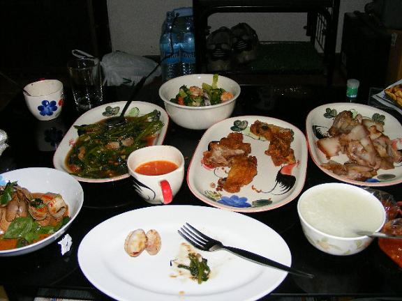 バレンタインデー サヨナラパーティー重なってむっちゃ忙しくって予想通り賄い作る暇も勿論作っても食べる暇も無かった大入り出ました!旅行帰り と 超過 労働?で何もせずにパタイ(討ち死に)漸く昼過ぎ起きましてPC開けてブログ開いたらパラ様更新して居るおー凄い忍耐心だ~ちょっとここでパラ様のPC環境を暴露するとインターネットめっちゃ遅い楽天のホームページ表示出るまで1分近く掛かりましてそれで管理・設定クリックしますよねそれが又一分近くかかってそれからブログ書く表示に又時間掛かって・・・・お借りした時は酔っ払っていて時間の感覚が狂っていたので書きましたが次の日に開けようとした時はもうめげて触るの止めました私は結構短気なので・・・・結論 パラ様は気が長~い・話変わってバンコクは 道が広いです!想像絶する広いです車だらけだし(車の為の道なのかも)その代わり歩道はひどいものです車道との段差30センチ以上あるのでは?それに荒れ放題 修繕する気は無いみたいで放置されてます歩き辛いったら無い!でもタイ人は直ぐタクシー拾ってしまって歩か無いそうですけど(初乗り35バーツ)100円しないんだものホテルからパラ様のおうちまでが夜なら30分位お昼は小一時間掛かりますが240バーツ位でしたそれでも500円位でしょうか?食べるものはめっちゃ安いですね大体一品が30バーツから40バーツこれじゃお家で炊事しないわけだ・・・・因みにアパート借りるとキッチンが無いそうですパラ様のところで食べたおかず酒が写ってませんが 多分是は昼食だと思います食べ初めて途中で気付いて撮ったので・・・・・かなり食べ散らかっている!パットパックブン(空芯菜炒めにはカオ トム(おかゆ))が付いて来る豚の顔 初めて食べたのですが 美味し~!特に頬肉が!唐突ですが行きのチャイナエアーの機内食是は行きのブン帰りもチャイナでしたが味は今一セントレアからの機内のスッチーはかなりレベル高かったのですが(美人ばっかりやった)台北からタイまではそれなりの方が多くてなんでかな?って帰りの便もそうやった・・・・そういえば台北からはジャンボだったのですがわたし34年ぶりに乗りましたわ然しジャンボの機内ってこんなに狭かったっけ?今はなきパンナムは天井も高くて広かった記憶が・・・・ホテルの前のタラー(ト)(市場)パラ様と行ったところはこの5倍以上の規模でした美味しいものも そうでないものも有りましたがもっと食べたかった!(物理的に無理ですが)スカイトレインかなり高い所を走っておりますが格好良い!ショッピングモールです3軒廻ったのですが何軒目かは忘れましたそのモールの片隅に神様祭ってありました日本じゃ考えられないので撮って見ましたが肝心の我々は写ってない・・・・・・・二人目の女の子と待ち合わせがセブンイレブン前だったので中に入ってみるとインスタントラーメン売り場が現地の有名ブランド マーマー(是だけでインスタントラーメンって意味も持ってるそうで)8バーツだった!24円位?日本は100円位しますよね?私が撮った写真ってこんなものなんですよもとより自分を写すと言う発想が有りませんのでレポートなんて到底無理かも!昨日はこの調子で書いていたら13465文字も有ってかなり削ったので話あっちこっち飛んでましたが今日もオーバーか?