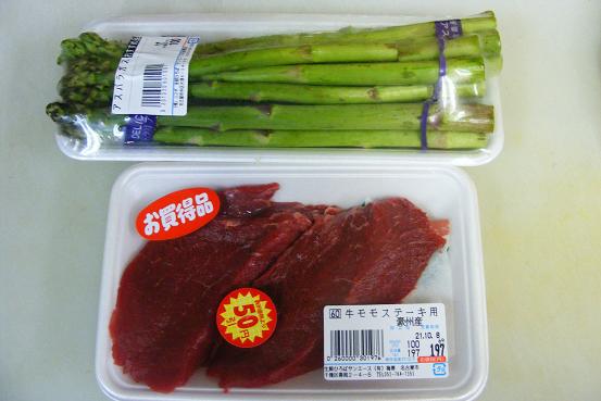 只今外は台風で大荒れです!実は2時で閉店になり私は1時半に帰らせて貰いました大正解!何時も通りに4時だったら私帰ることあたわず!お外は強風プラスティックのゴミ箱が空を飛んでおります此処は8階なので相当な高さなのですがそれが私の部屋にぶつかってこない幸運に感謝してます!怖いんだよー!!風向きが変わって此方には吹き付けなくなってきました少しは通り過ぎていったのかな?それはさて置き買出しに行けば私には矢張り是が目に入ってきて止められない・・・・・・・アスパラ3把で100円腿ステーキがグラムで100円!買うなって?!出来る訳無いっしょ!!!!で2人前で是ですが何か?!一人前150円しなかった・・・・・・是が嬉しい私は蒲鉾貧乏性で御座います!!!!!!!恥ずかしく無いもんね・・・・・・