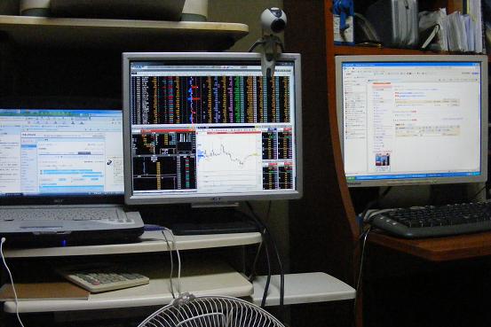 久し振りにチャート見ていると余りにもブランクが有りすぎて読めない!!!!暫くトレーニングしないといきなりは無理だわ・・・久し振りの取引画面です一番左の小さいモニターが動きののろい(ラップトップPC)モニター1枚増やしたのが動きが悪くなった原因?でも是が無いとプレミアムウエブの意味が無い!?上の画面で赤いのが上げ銘柄勿論青いのが下げ銘柄ですが赤いマーカーを集めて其れのみを表示する画面を作ります其の中で比較的ピークから遠い銘柄見つけて買うのが基本なんですが任意に選んだ銘柄を下の チャート と 板(幾らの値段に幾つ買いまたは売りが有るのかをあらわす表) で判断しますチャートの任意の場所で右クリックすれば其の侭 売り か 買い の注文画面が出てきて売買が出来てしまいますこの一面で50銘柄登録できるのでシート 1 から 40 迄で2000銘柄登録できますが打ち込むだけで相当な時間と根気が・・・・兎に角出勤するまでの一時間位をトレーニングの時間に当てましょうかね?!